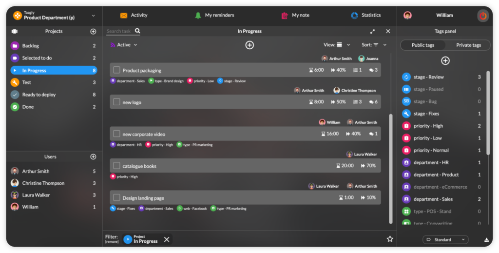 to program polskiej produkcji, w którym stworzysz listę zadań, określisz priorytety i skontrolujesz przebieg realizacji projektu. W prosty sposób możesz wygenerować wartościowe raporty, z których jasno wynika czy założone terminy są zagrożone. Na bieżąco mierzysz czas pracy swojego zespołu. W każdej chwili masz szansę na wprowadzenie zmian zapobiegających ryzyku niedotrzymania szacowanych dat. Taagly daje Ci kontrolę nad wszystkimi zadaniami toczącymi się w firmie. Widzisz nad czym aktualnie pracują Twoi podwładni. Znasz poziom obciążenia poszczególnych osób, wiesz które zadania były najbardziej czasochłonne.