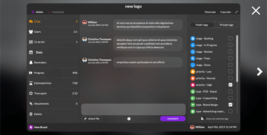 Przepływ komunikacji ułatwia chat. Rozmowy prowadzone są na różnych płaszczyznach. Dostępny jest tryb prywatny, można przypisać konwersację do konkretnego zadania lub całego projektu. Z poziomu chatu następuje wymiana plików oraz dostarczane są powiadomienia.